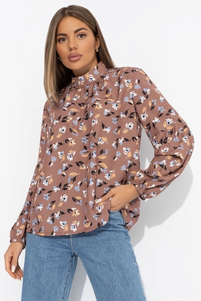 Блуза коричневая с длинными рукавами от компании Charutti. Модель свободного кроя, выполнена из плательного полотна "Ниагара" с принтом. Горловина оформлена воротником-стойкой. Изделие хорошо смотрится в заправленном виде и навыпуск. Рукава оформлены скрытой резинкой. Блуза хорошо смотрится на любом типе фигуры. Отличный выбор для офисных модниц.