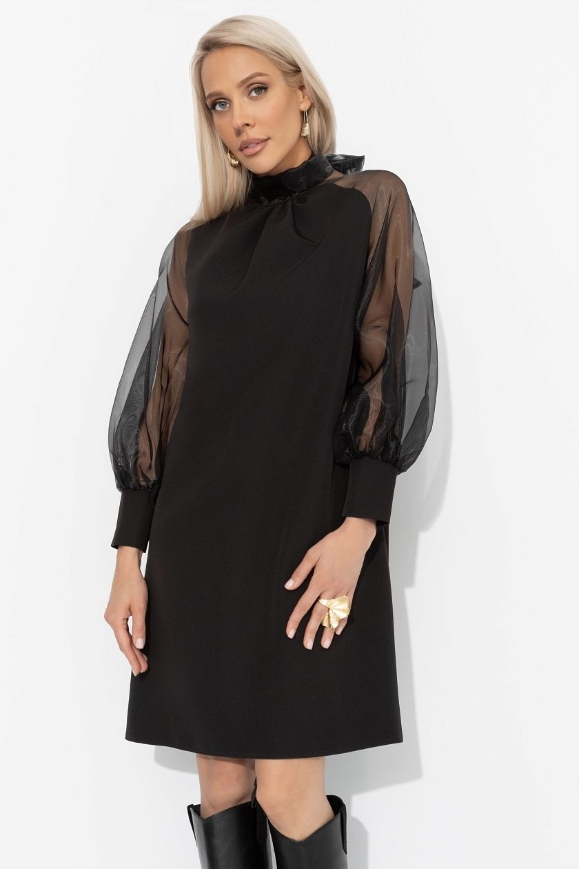 Платье чёрное с бантом из органзы от компании Charutti. Модель свободного силуэта, выполнена из костюмной ткани "барби". Воротник-стойка. Длинные рукава-реглан на манжетах. Идеальный выбор для создания женственного образа.