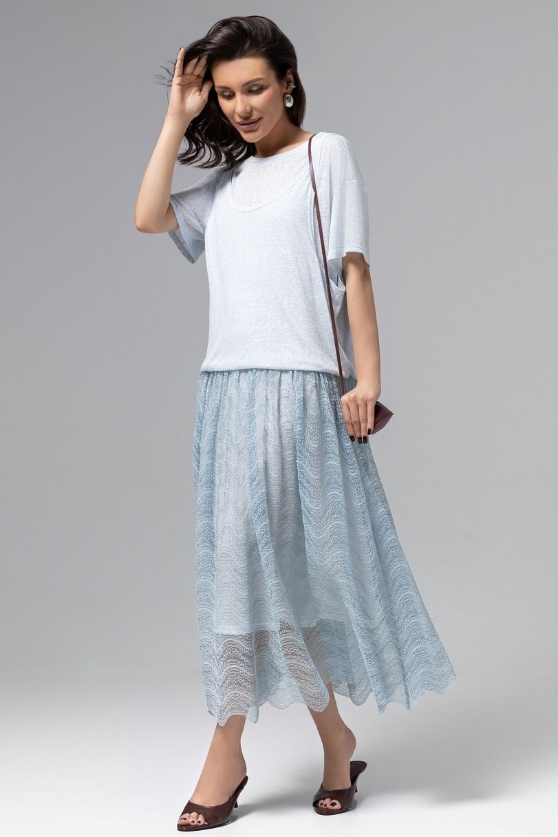 Платье голубое комбинированное с кружевом от компании Charutti. Модель полуприлегающего силуэта. Круглый вырез горловины. Многослойный верх –имитация сочетания майки и футболки. Акцентный крой спинки. Есть подклад.Прекрасный вариант для торжественного мероприятия.