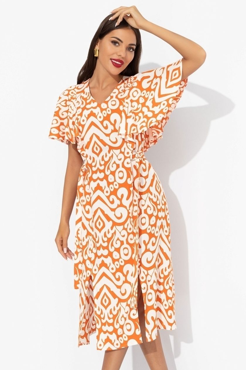 Платье летнее оранжевое с разрезом от бренда Charutti. Модель полуприлегающего силуэта, выполнена из штапельного полотна с принтом. V-образный вырез горловины. Линия талии регулируется вшитым поясом с металлической фурнитурой. Рукава изделия в виде объемных рюш. Стильный вариант для создания женственного образа.