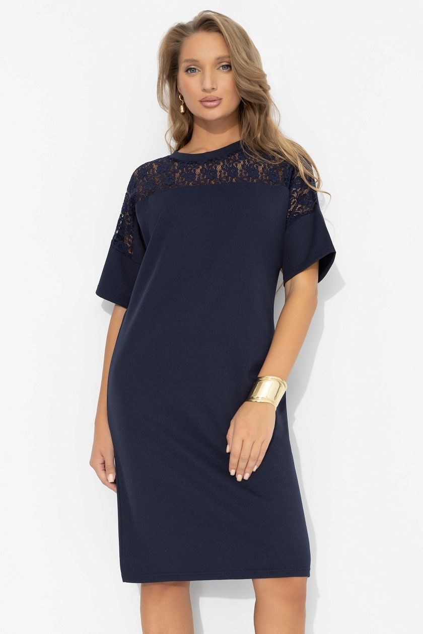 Платье трикотажное синее с кружевом от компании Charutti. Модель прямого силуэта, идеально садится на любой тип фигуры.Округлый вырез горловины. Втачные короткие рукава. Низ ровный, без разрезов. Идеальный выбор на каждый день.
