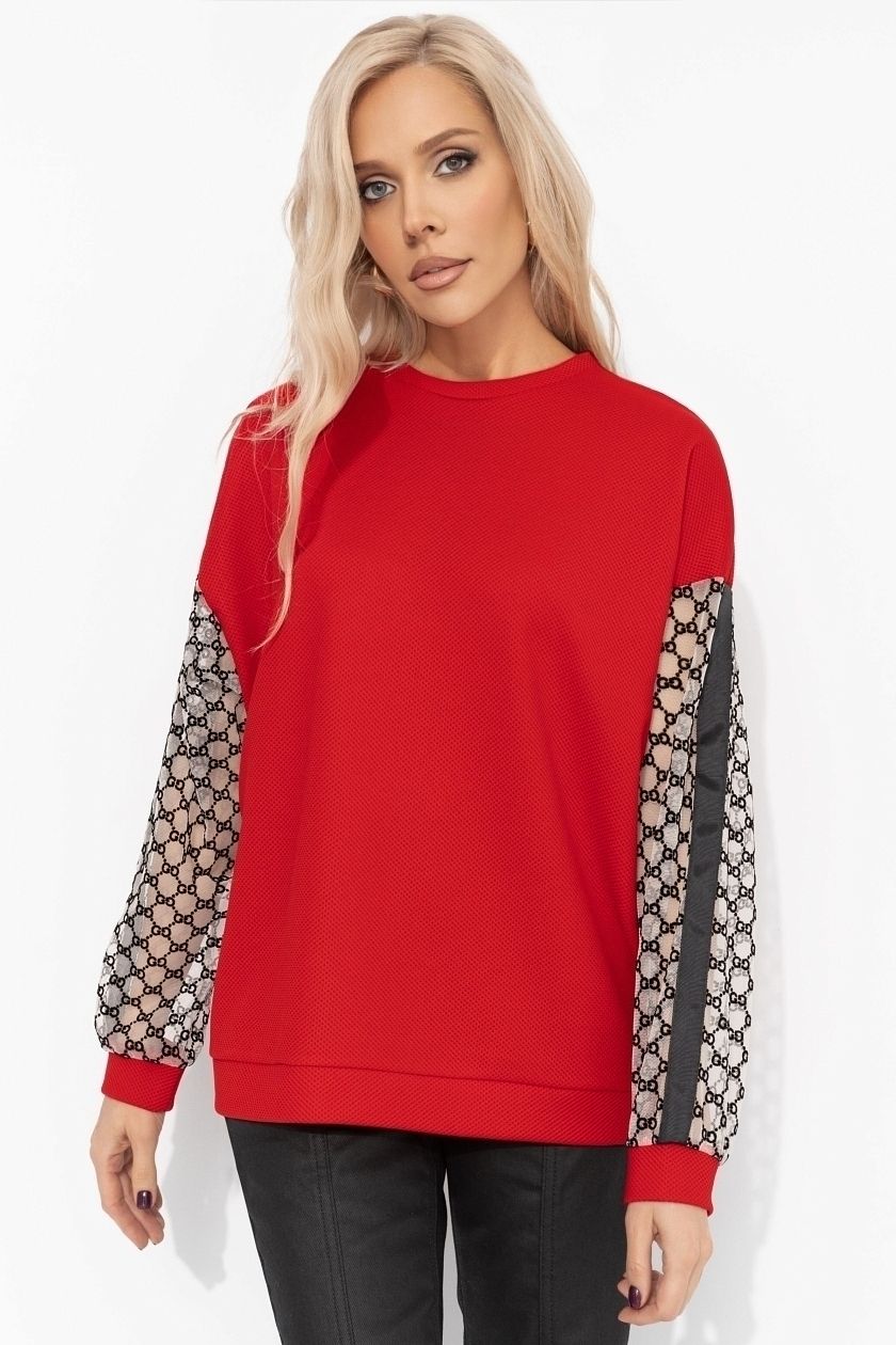 Свитшот красный с акцентными рукавами от компании Charutti. Модель свободного кроя, удлиненная. Свитшот выполнен из ткани Фукро. Круглый вырез горловины. Рукава декорированы акцентной тканью с текстурным узором и лампасами.. Прекрасное решение для создания стильного образа.