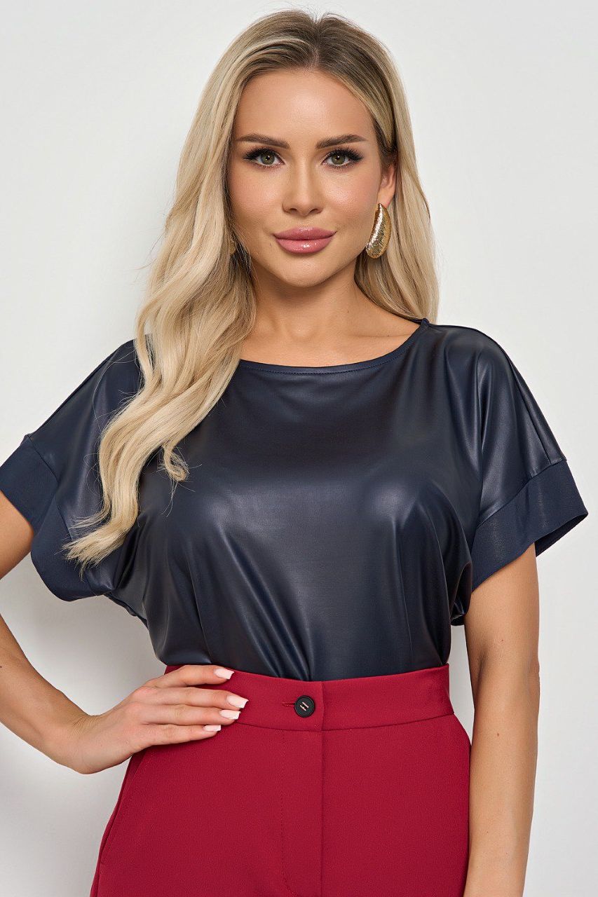 Блузка тёмно-синяя из искусственной кожи от компании Jetty. Изделие прямого силуэта, круглый вырез горловины. Короткий цельнокроеный рукав. Прекрасный выбор для Вашего повседневного гардероба.