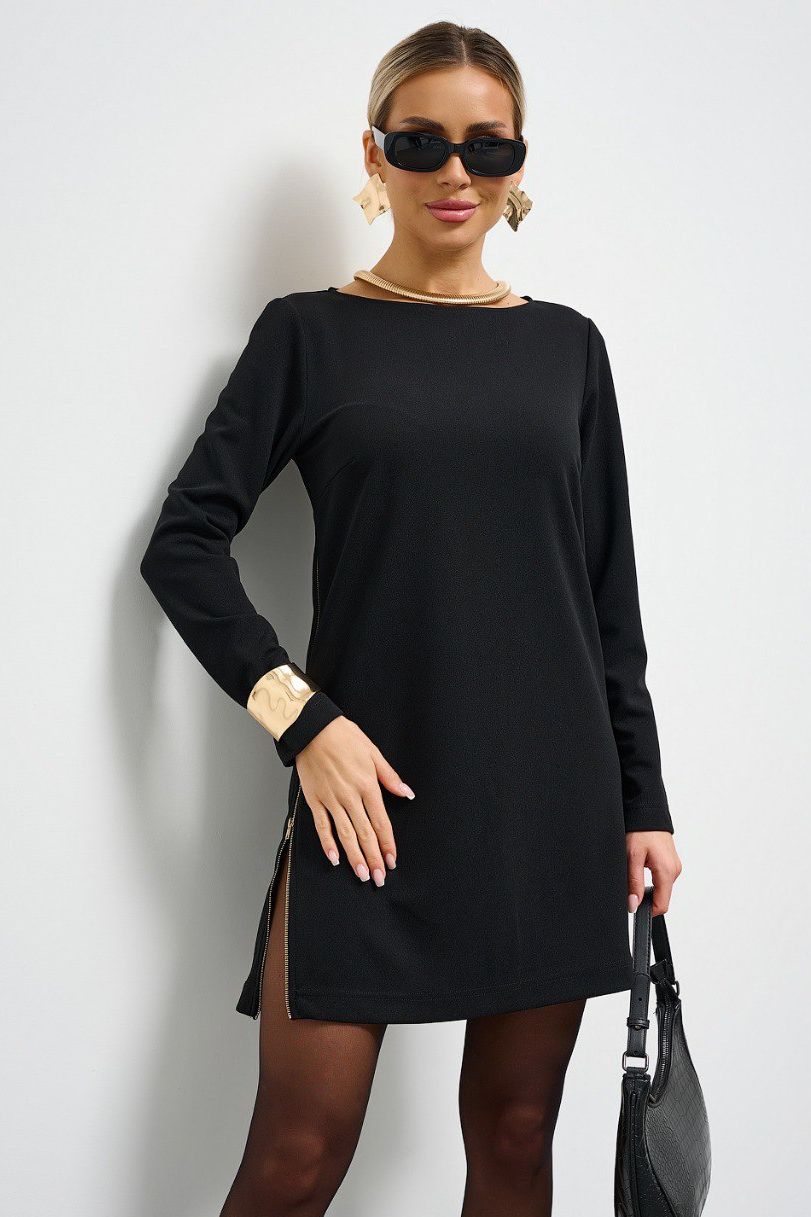 Платье чёрное с молниями в боковых швах от бренда Jetty. Модель А-силуэта, выполнена из крепа. Вырез горловины - лодочка. Длинный втачной рукав. Спинка со средним швом. Удачный выбор для повседневного гардероба.
