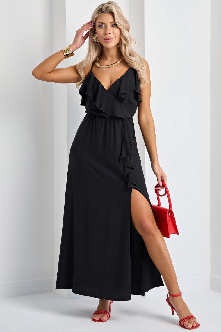 Платье длины макси чёрное с разрезом по переду от компании Jetty. Модель с расклешенной юбкой, выполнена из текстильного полотна. Отрезное по линии талии. Талия на резинке. Верх выполнен в виде запаха с оборками по линии декольте, которые переходя на линию разреза по юбке. Лямки с регилировкой длины. Идеальный выбор для создания женственного образа.