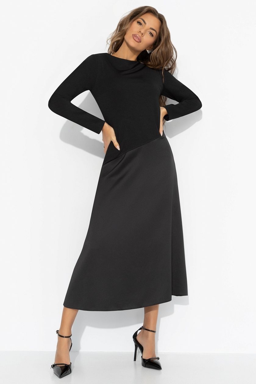 Платье чёрное комбинированное от компании Charutti. Модель полуприлегающего силуэта, с удобной посадкой. Скошенная линия по талии скульптурирует фигуру, а трикотаж «скуба» дарит мягкость, плотность и комфорт.