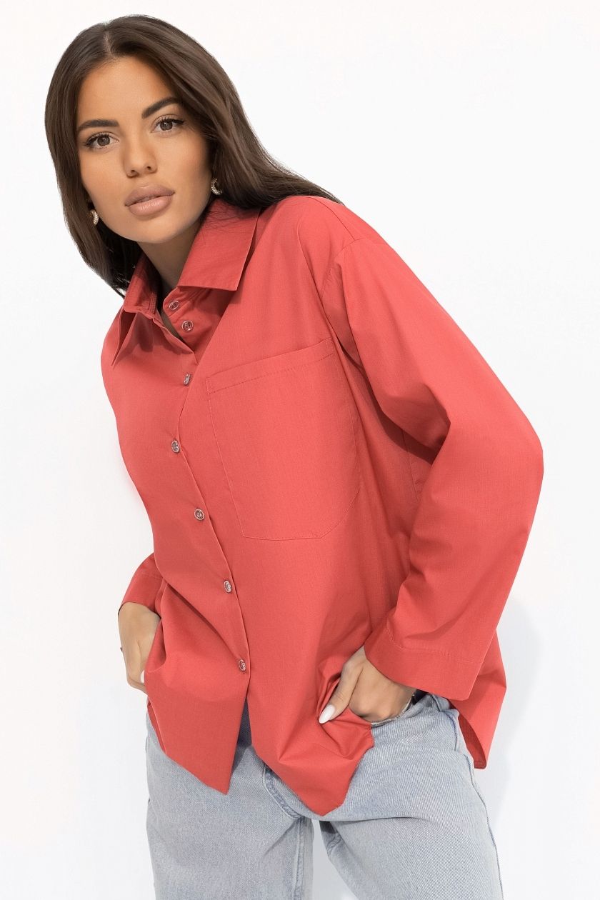 Рубашка с декором на спинке от компании Charutti, выполнена из костюмной ткани "Кагзи" в розовом цвете. Акцент в виде металлической цепи со стразами по спинке изделия. Есть треугольный вырез на спинке. Карман на передней стороне изделия. Изделие хорошо смотрится на любом типе фигуры.