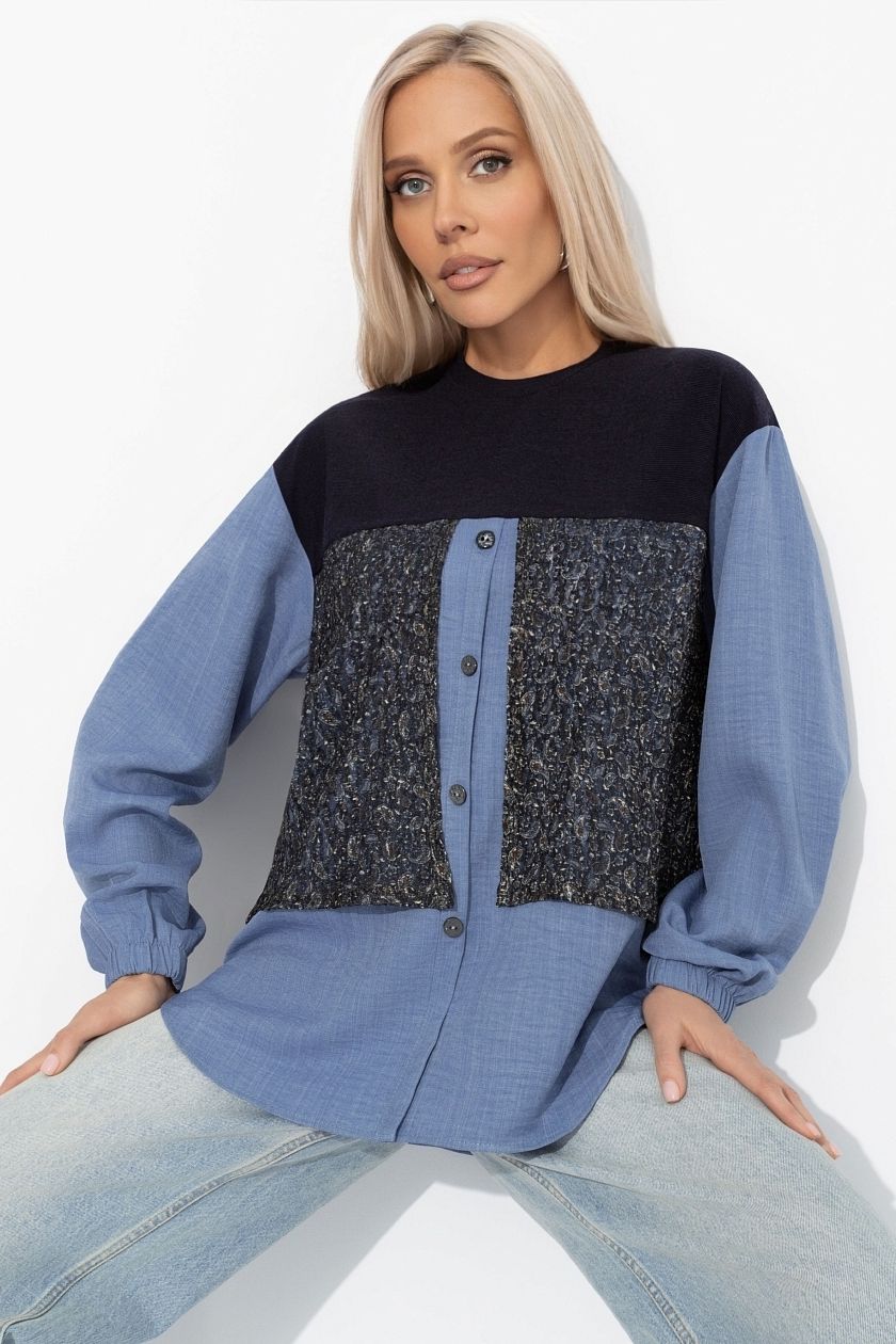 Свитшот комбинированный голубой с имитацией рубашки от компании Charutti. Модель прямого силуэта, выполнена из плательной ткани "ниагара" и трикотажа. Круглый вырез горловины. Втачные длинные рукава на резинке, со спущенной линией плеча. Низ фигурный. Идеальный выбор на каждый день.