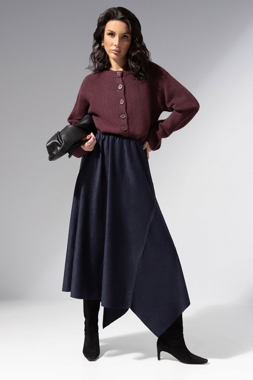 Юбка макси синяя из эко-замши асимметричного кроя от компании Charutti на трикотажном подкладе. Эластичный пояс на скрытой резинке. Материал приятный на ощупь, драпируется и сохраняет форму. Акцентные декоративные швы. Идеальный выбор для создания женственного образа.