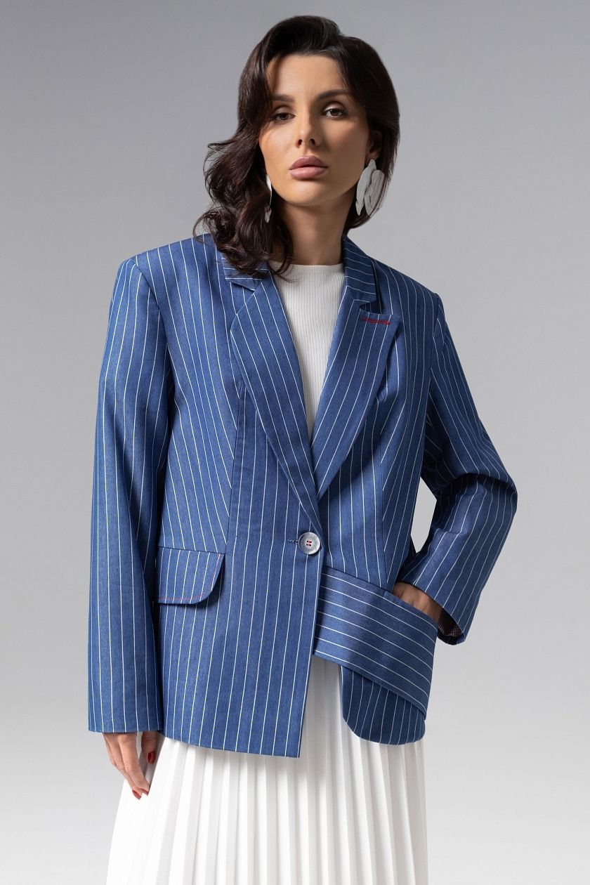 Жакет асимметричного кроя синий в полоску от компании Charutti. Выполнен из костюмной ткани "джинс". Модель однобортный с лацканами свободного кроя. Изделие с карманами на подплечниках. Жакет на подкладе. Можно стилизовать с юбками, брюками и джинсами.