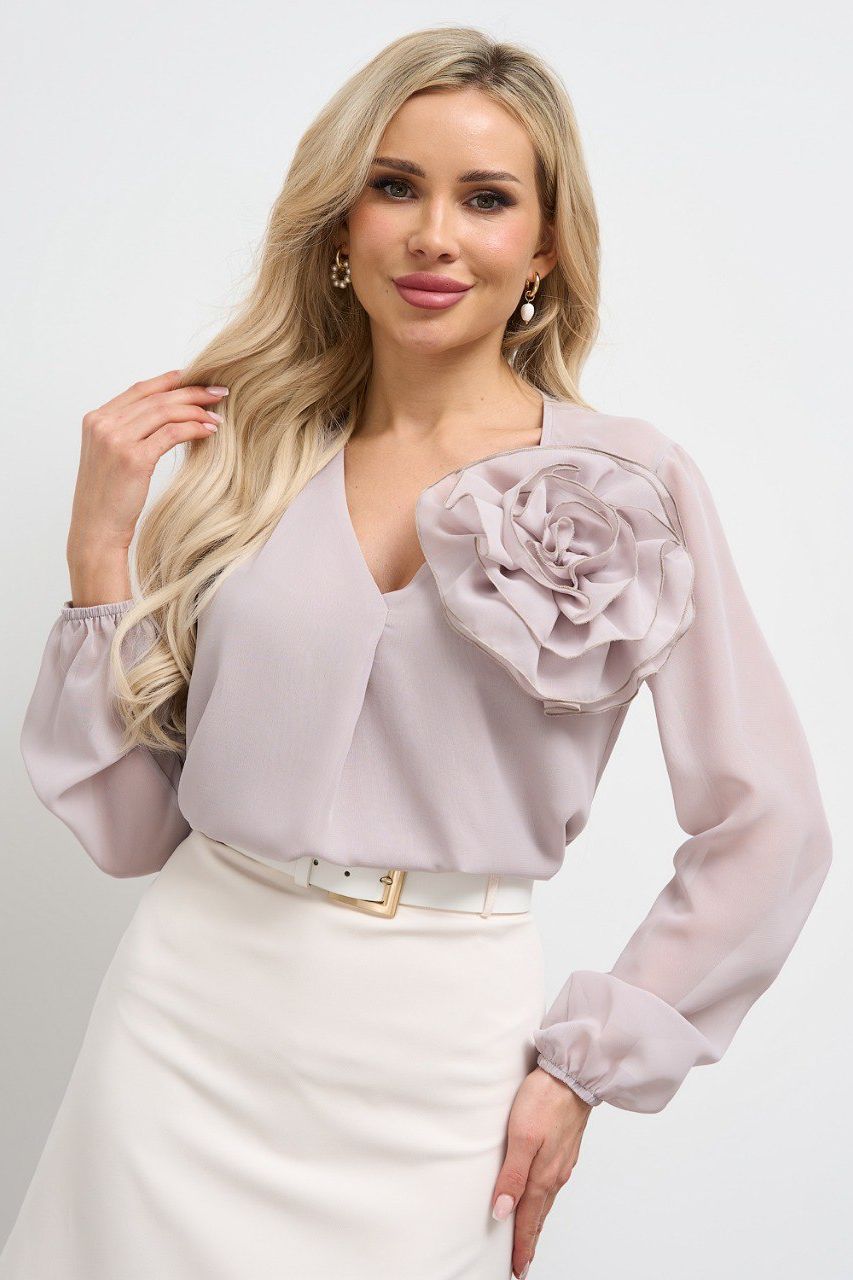 Блузка светло-серая с объёмным цветком от компании Jetty. Модель свободного силуэта, выполнена из блузочной ткани. V-образный вырез горловины. Втачные длинные рукава с резинкой. Без застёжки и подклада. Прекрасный образ для создания женственного образа. Декоративный элемент роза отстегивается - можно носить как с розой, так и без неё.