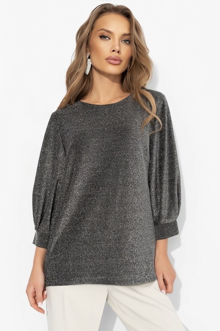 Блузка трикотажная с люрексом в цвете серебро от компании Charutti. Модель прямого силуэта, застегивается на деликатную пуговицу по спинке изделия. Блуза хорошо смотрится в заправленном виде и навыпуск. Прекрасное решение для создания стильного образа.