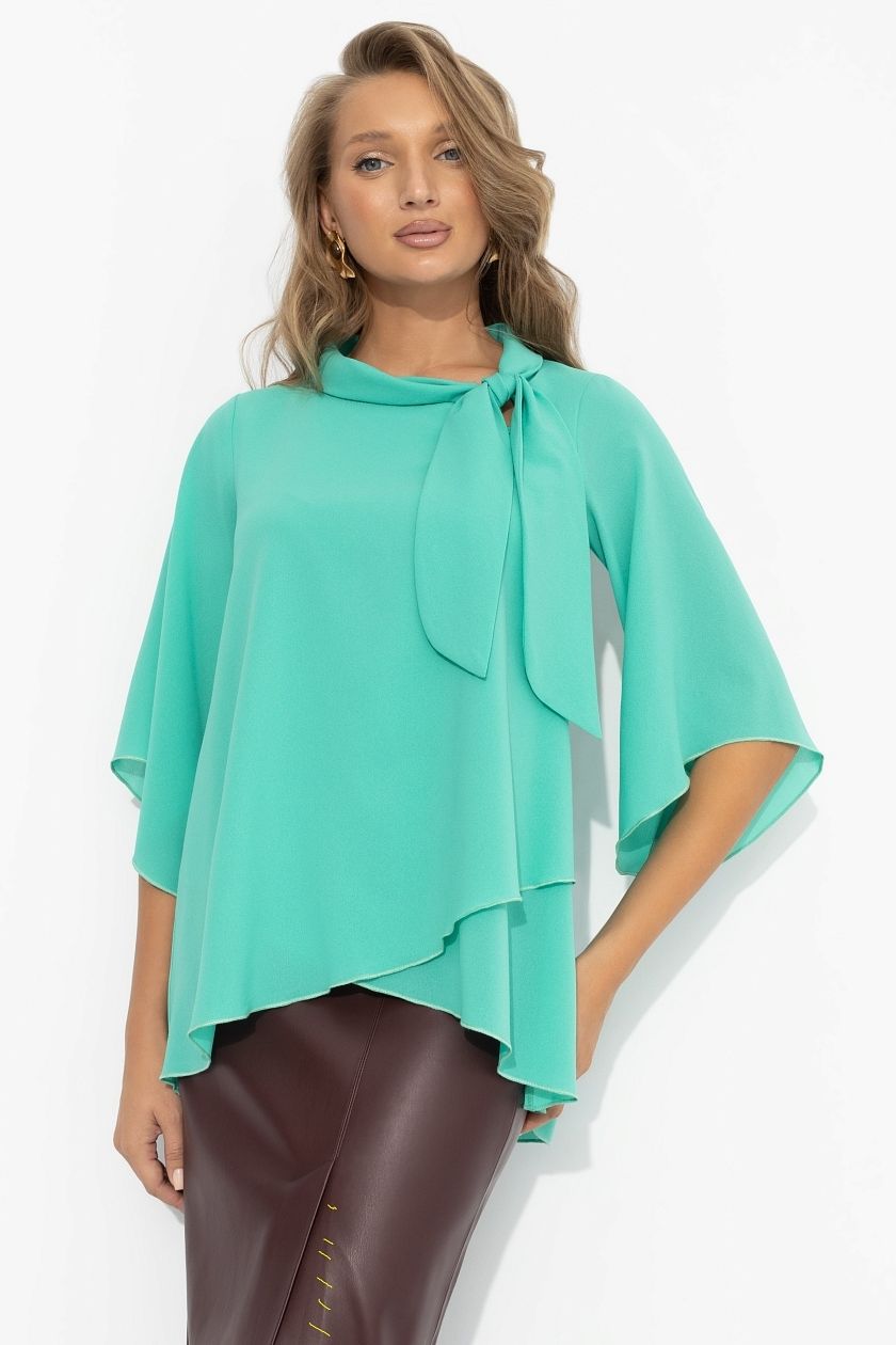 Блузка зелёная с эффектом многослойности от компании Charutt, выполнена из креп-шифона. Модель свободного силуэта, воротник "хомут" с завязками на бант. Втачные укороченные рукава. Низ асимметричный. Отличный выбор для похода в гости.