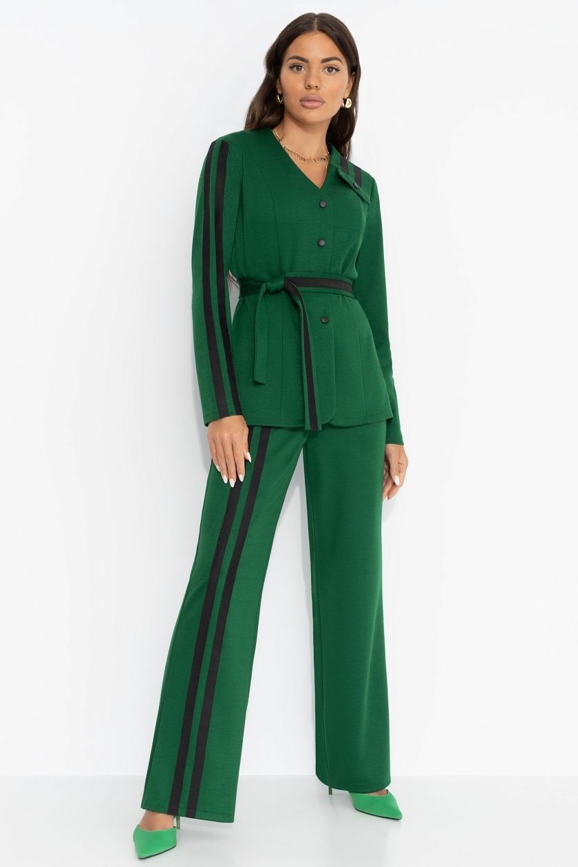 Костюм зелёный брючный с лампасами от компании Charutti, выполнен из трикотажной ткани «лакоста». Брюки прямого кроя с контрастными лампасами и жакета. Жакет застегивается на клепки. Есть разрезы по бокам изделия. Брюки с карманами. Пояс на скрытой широкой резинке. Пояс в комплекте. Отличный выбор для Вашего безупречного образа.