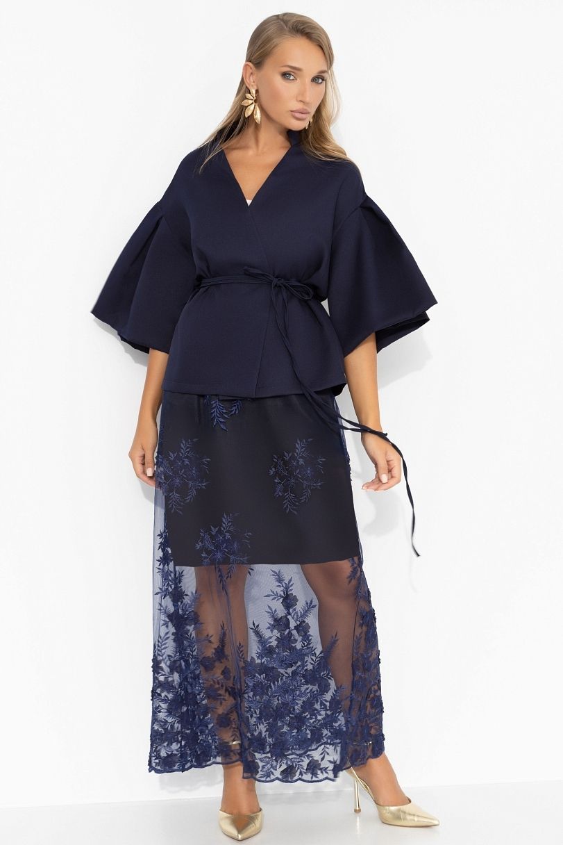 Костюм синий с юбкой дизайнерский от компании Charutti, выполнен из костюмной ткани «барби». Жакет свободного кроя на запах. Тонкий пояс в комплекте. Юбка с подкладом. Верхний слой из тонкого кружева. Пояс юбки на резинке. Отличный выбор для Вашего безупречного образа.