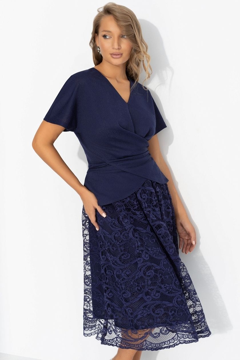 Костюм синий с юбкой нарядный от компании Charutti, выполнен из трикотажного полотна "жаккард". Блуза с коротким рукавом. Юбка из кружева с подкладом. Пояс на резинке. Отличный выбор для создания романтичного образа.