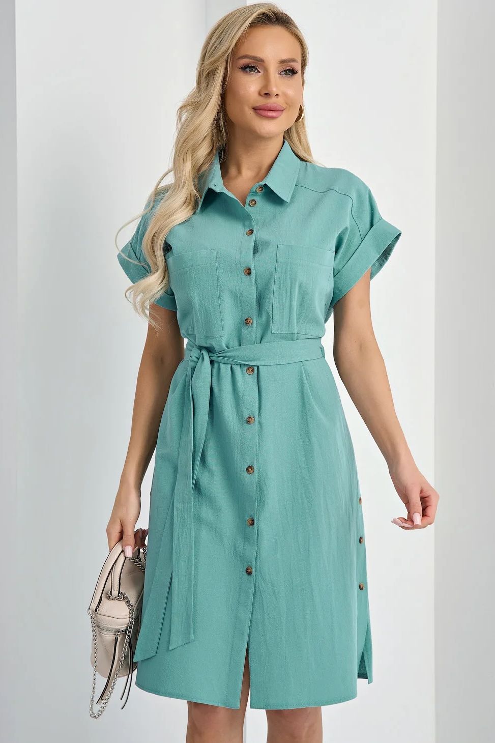 Платье-рубашка мятного цвета с поясом от компании Jetty. Модель ппрямого силуэта в стиле "сафари" из хлопка. Короткий цельнокроеный рукав на широкой манжете. Воротник рубашечного типа. В боковых швах расположены декоративные планки с роговыми пуговицами. Спинка с отрезной кокеткой. Идеальный выбор на каждый день.