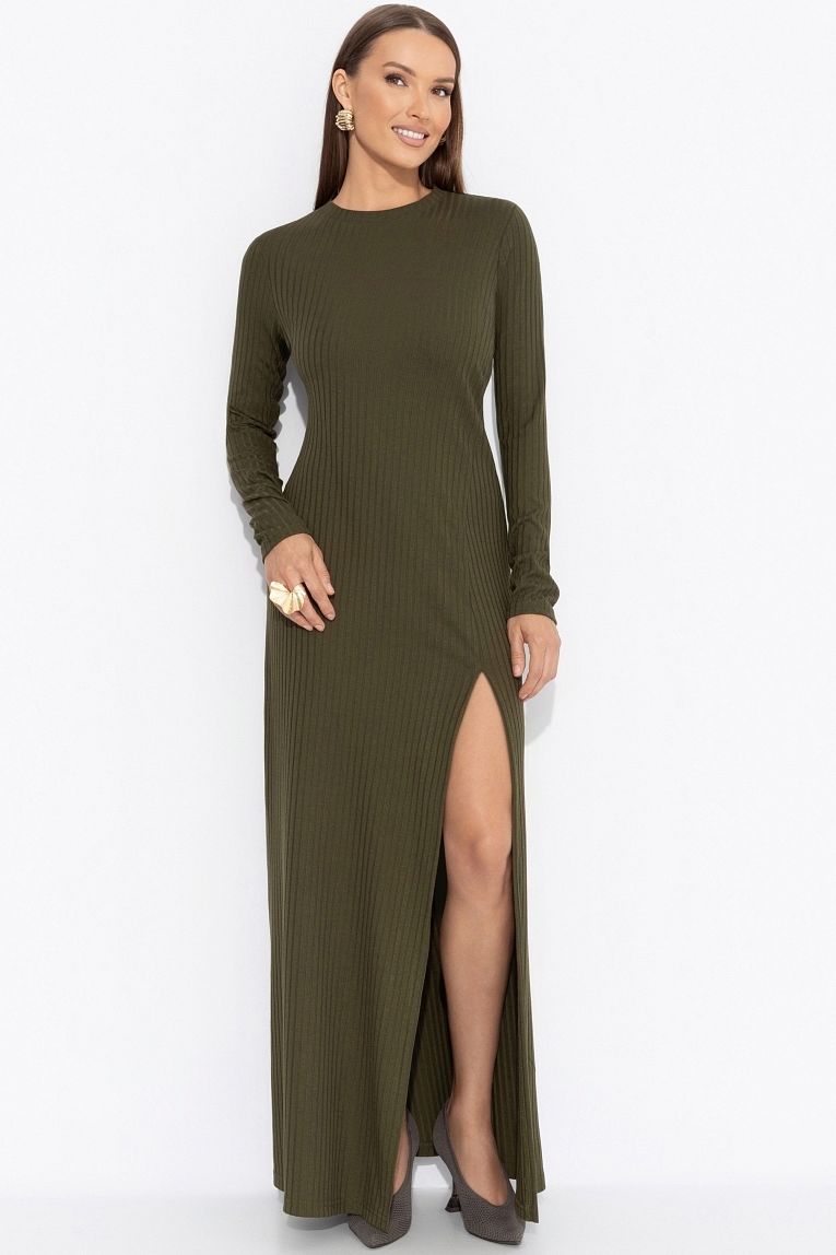 Платье длинное зелёное из трикотажа-лапша от бренда Charutti. Модель прилегающего силуэта, глубокий разрез с одной стороны изделия. Материал в рубчик. Комфортная посадка. Чуть удлиненный рукав. В этом платье вы будете королевой вечера!