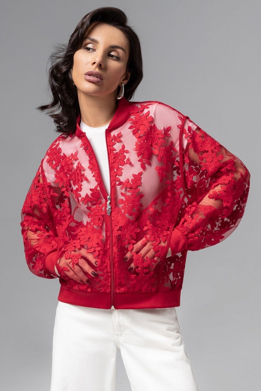 Бомбер красный из сетки с вышивкой